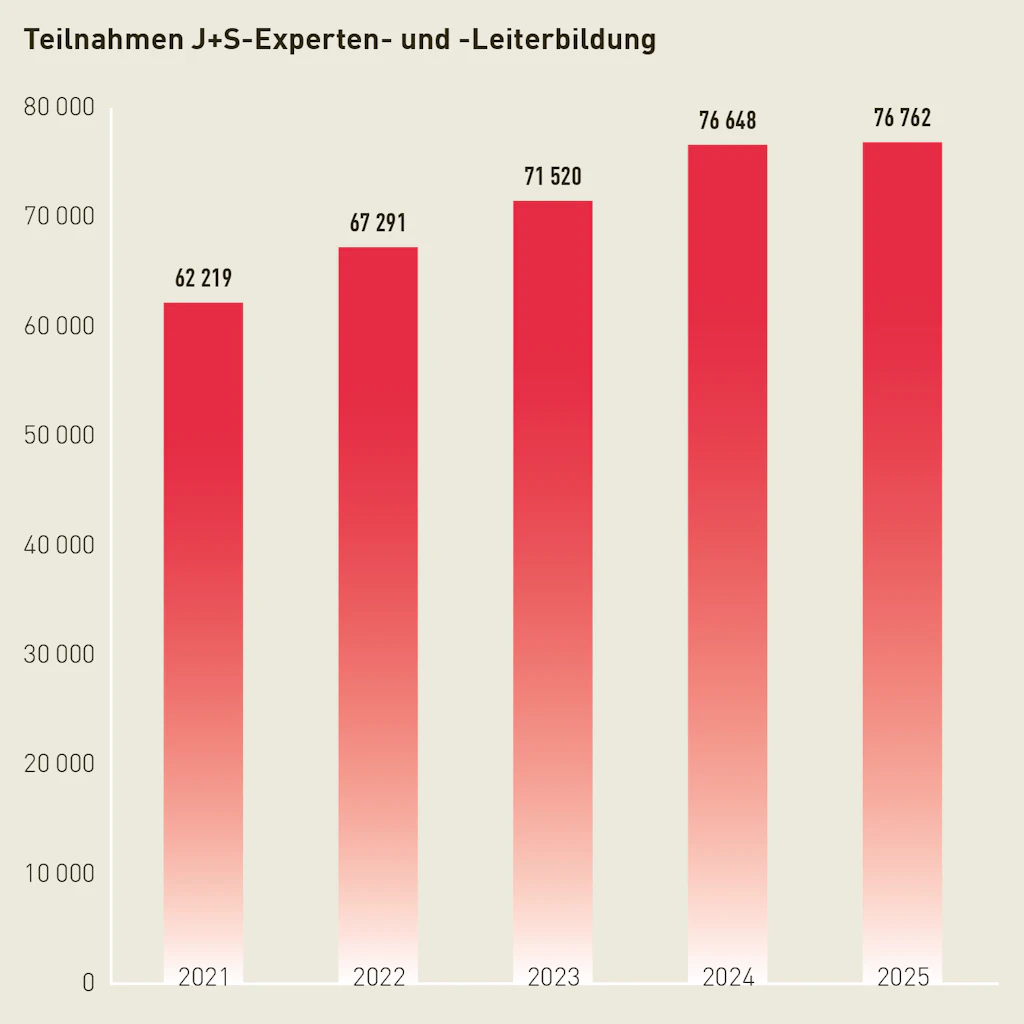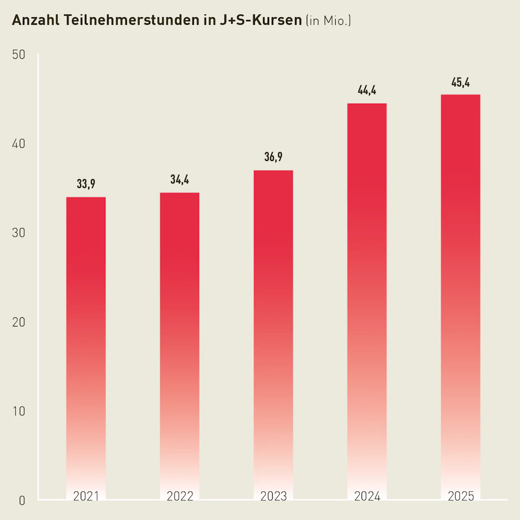 Die 703’700 Kinder und Jugendlichen absolvierten 2025 45,4 Millionen Stunden in J+S-Kursen sowie 2 Millionen Tage in J+S-Lagern. Das Wachstum ist auf Massnahmen der «J+S-Agenda 2025» zurückzuführen.