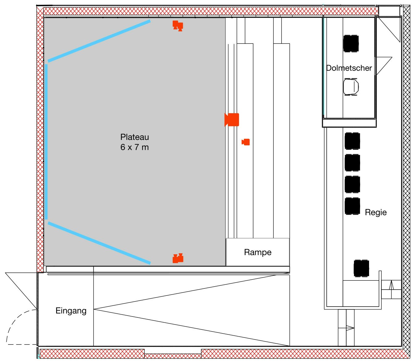 - Kameras: 5 PTZ, 1 Kamera-Roboter auf Schienen