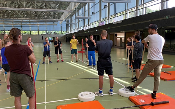 S’entraîner avec des haltères est une chose, le faire correctement en est une autre. Soulever des poids ne s’improvise pas compte tenu du risque élevé de blessures. Il faut apprendre les bons gestes auprès d’experts qui les enseignent méthodiquement. Une règle d’or appliquée dans la formation qui se déroule sous nos yeux. Christian Thomas présente aux participants plusieurs exercices préparatoires avec un simple bâton. Les haltères ne seront intégrés aux exercices que dans un deuxième temps, en commençant par une barre. «L’important est qu’après ce cours, je puisse montrer à mes athlètes comment s’y prendre», indique Roger Kamber, l’entraîneur de l’équipe féminine suisse de saut à ski, qui suit ce cours avec une vingtaine de collègues venus de différents sports.