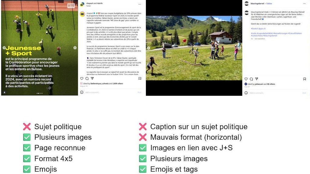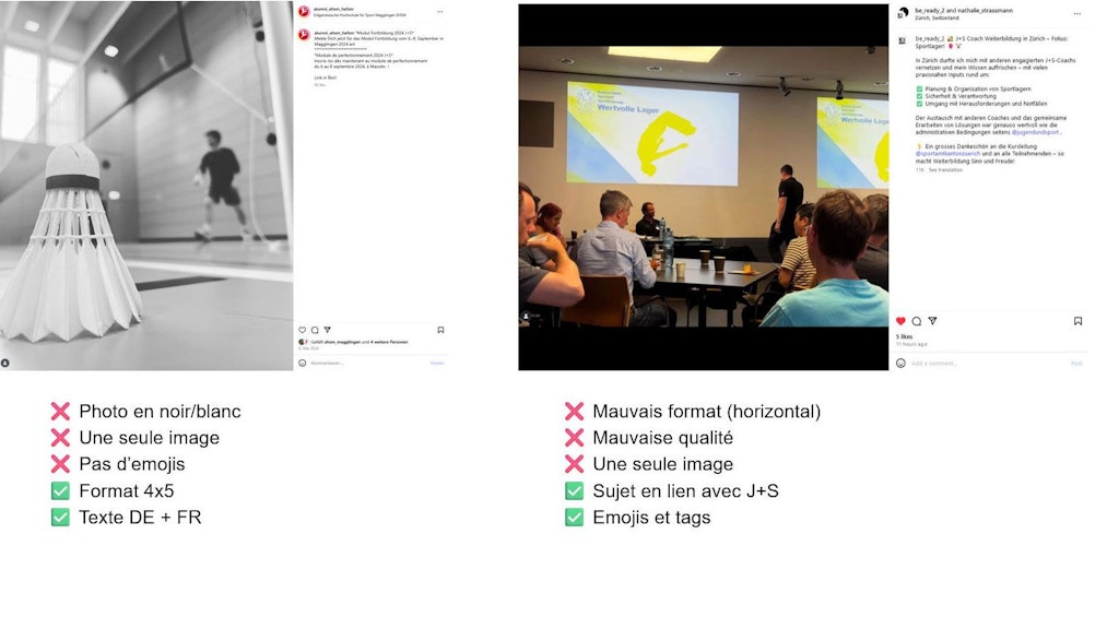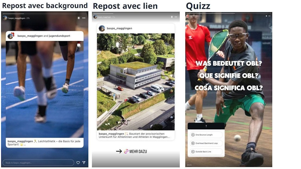 Les Collab-Posts avec les pages OFSPO, HEFSM et J+S doivent être convenus en amont avec socialmedia@baspo.admin.ch afin de déterminer les éléments suivants: