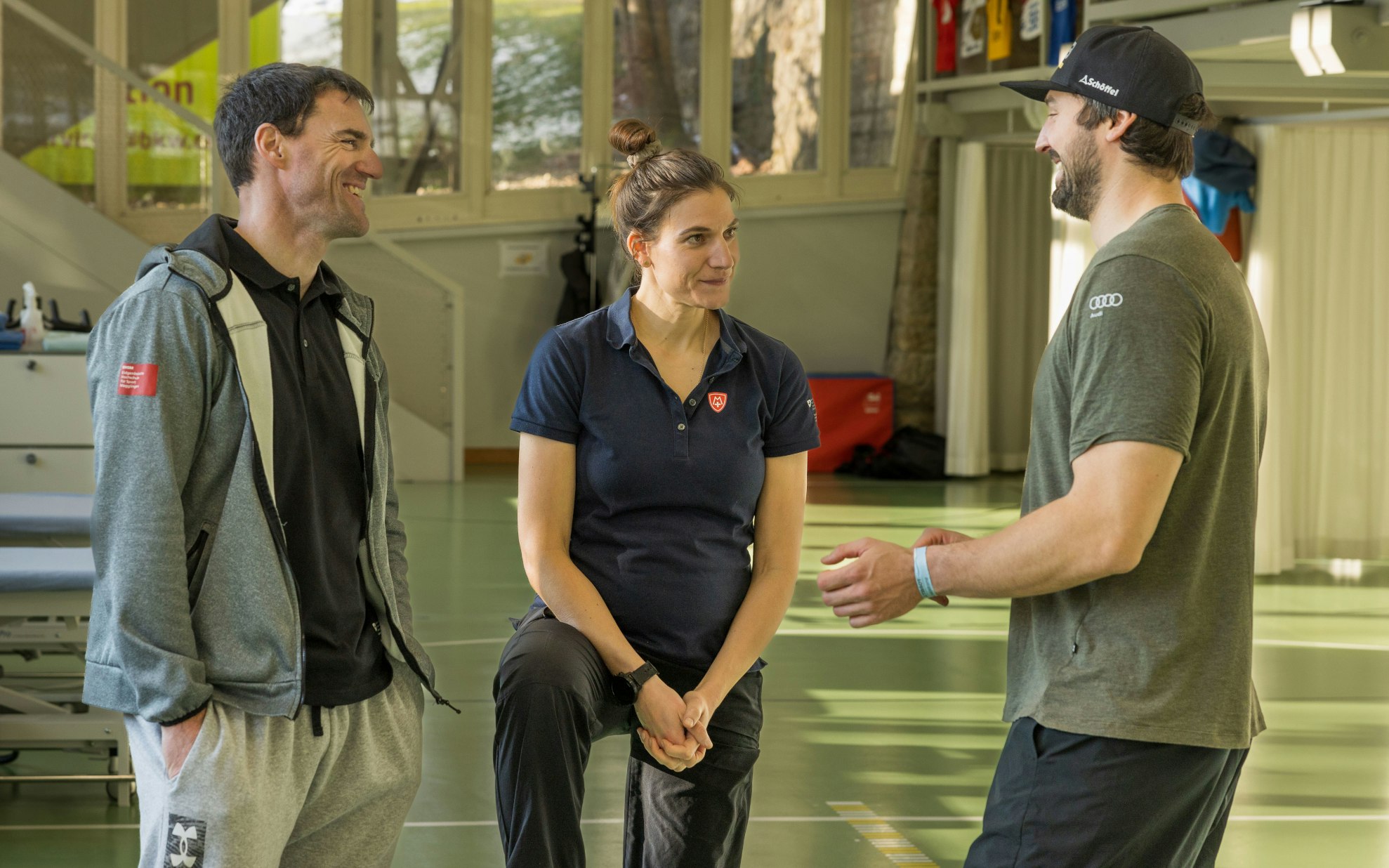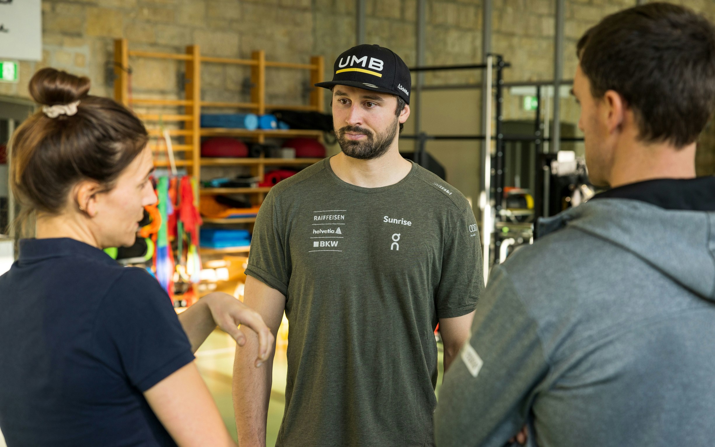 Ryan Regez est bien décidé à s’aligner à nouveau la saison prochaine et même, si possible, à participer aux entraînements en équipe dès le mois d’août. Il se donne à fond pour cela et peut compter sur une palette complète de prestations à Macolin: physiothérapie, massages, psychologie du sport, développement de la force, toutes localisées au même endroit et soigneusement coordonnés. «La collaboration interdisciplinaire est le grand atout de Macolin», souligne Jan Seiler, l’expert de l’entraînement de la force qui vient rejoindre Regez et Schmid ce matin-là.