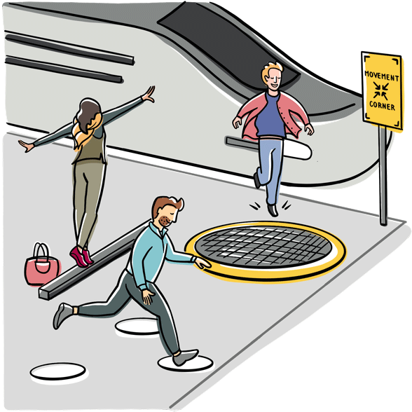 Le projet pilote «Movement Corner» entend créer des possibilités d’activité physique dans les gares et ainsi trouver des solutions à ces problématiques en mettant à profit un lieu central. Créer des «coins mouvement» rassemblant des appareils, mais aussi des autocollants et des affiches proposant des idées d’exercices devrait inciter les jeunes et moins jeunes à être plus actifs durant les temps d’attente et à tester ces mouvements. Et à ceux et celles qui n’ont pas envie de s’adonner à ces exercices au milieu des passants ou qui n’ont pas (encore) trouvé le courage nécessaire pour se lancer, les «coins mouvement» offrent aussi la possibilité d’échanger avec des spécialistes de l’activité physique et d’obtenir des conseils sur la manière d’intégrer plus largement le mouvement à leur quotidien. Rendre l’activité physique dans l’espace public plus naturelle, telle est l’ambition de ces mesures.