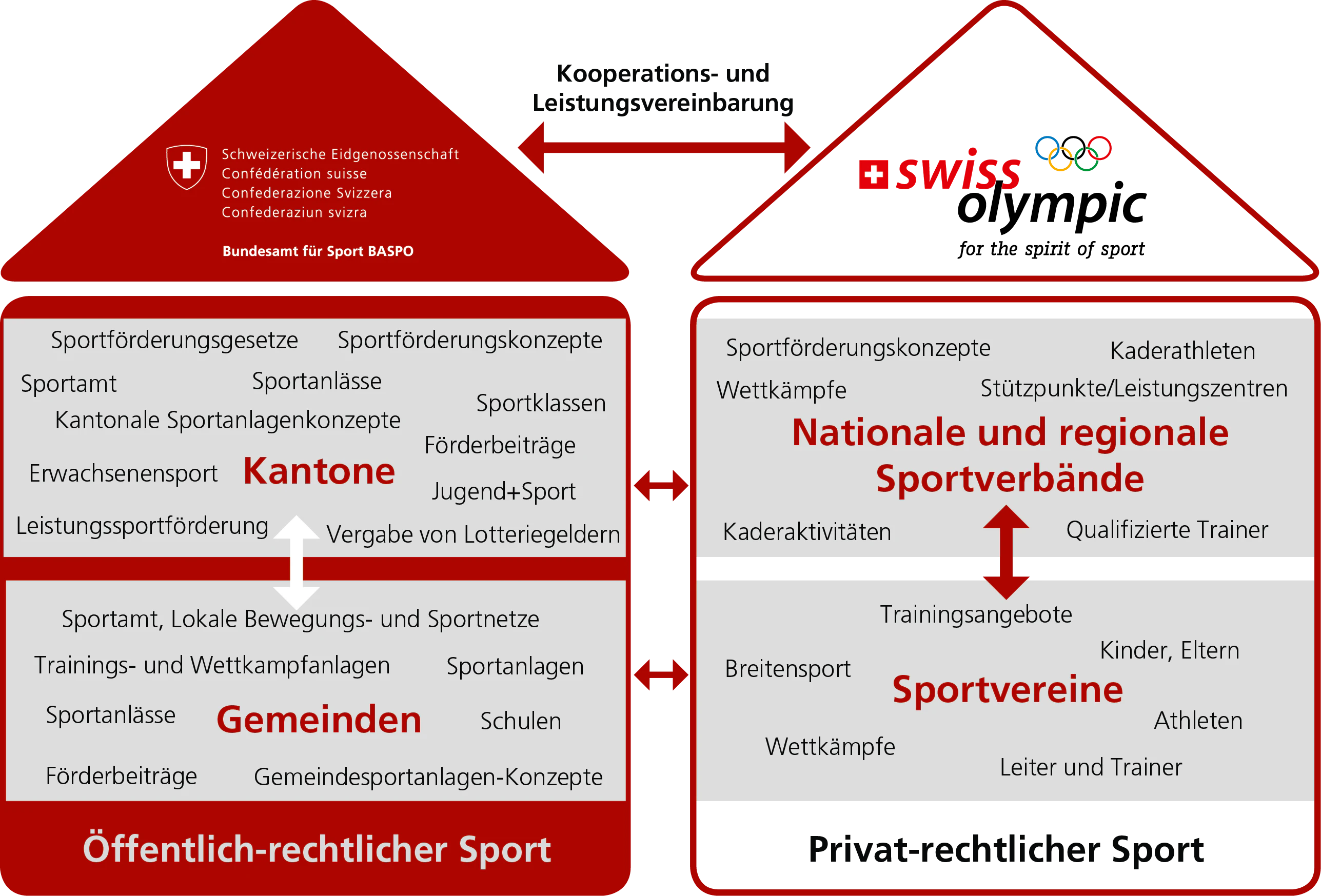 L'accord de coopération qui règle la collaboration stratégique entre l'OFSPO (droit public) et Swiss Olympic (droit privé) vise à renforcer le sport suisse et son rôle social. La convention de prestations définit pour sa part tous les domaines de collaboration opérationnels (prestations réciproques et flux financiers).