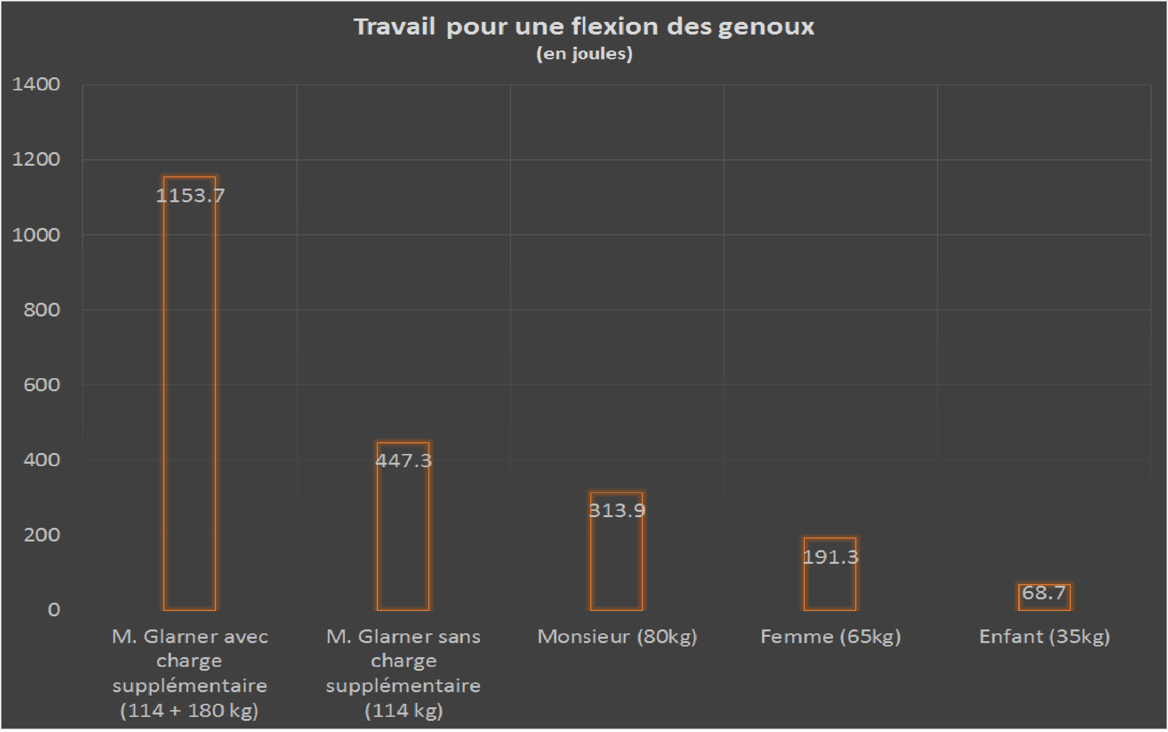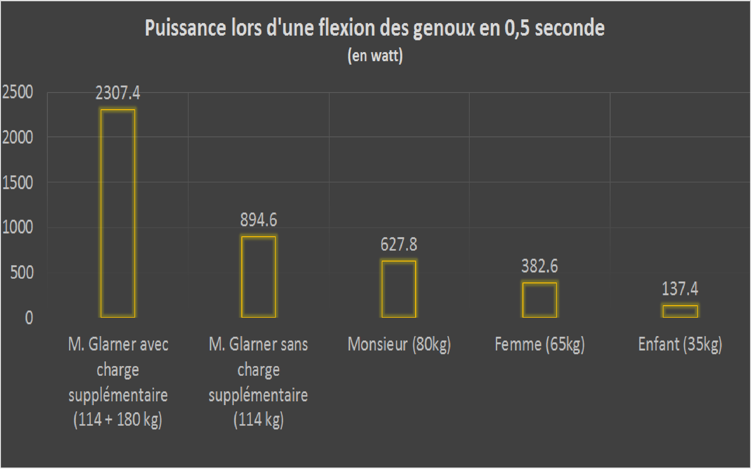 Un enfant pesant 35 kg devrait donc effectuer une flexion des genoux en 0,03 seconde pour déployer la même puissance que M. Glarner avec une charge supplémentaire. (Si l'enfant faisait la flexion en 1 seconde dans les mêmes conditions, il ne déploierait «que» 17,2 watt.)