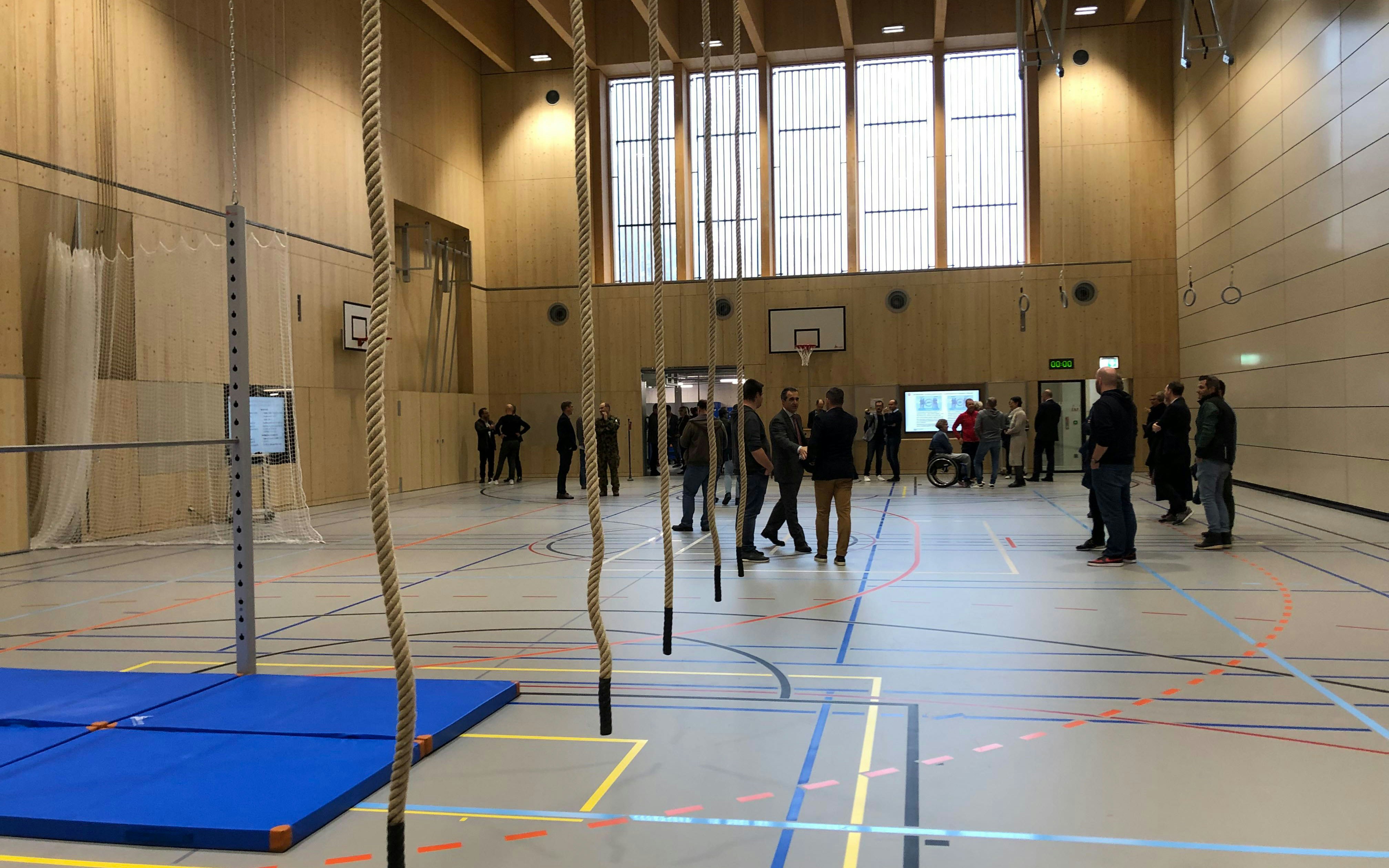 Après deux ans de travaux, l’Office fédéral du sport OFSPO a inauguré à Macolin une nouvelle salle de sport qui va lui permettre de mener ses activités de formation dans des conditions optimales. La nouvelle construction abrite une salle de sport triple parfaitement équipée pour la pratique de nombreux sports ainsi qu’une salle de lutte.